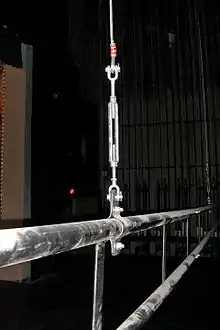 Trim chains and shackles, or turnbuckles and pipe clamps, typically connect the lift lines of a line set to the batten they support. Those connections facilitate minor adjustments to, trim, the effective length of a lift line. By trimming the lift lines, loads are more evenly distributed to them. Turnbuckles are moused (secured against free rotation) to prevent the jaws from slowly unscrewing over time due to vibrations incurred during normal use.