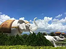 The Front Hall is flanked by the Gate of Perfect Ease and the Gate of Liberation. The lion and elephant, both accompanied by smaller cubs, welcome guests from either side of the doors. The elephant on the right, measuring five-meter tall and six-meter long, symbolizes the conception of Prince Siddhartha who entered the womb of his mother on a white elephant. The lion on the left has the same measurements and represents the Buddha's roar of teachings. Inside, visitors can borrow wheelchairs and baby-strollers from the Information Desk. There are restaurants and a buffet, all so visitors can rest their feet or grab something to eat. A Starbucks can also be found here, which was included to make visitors feel more at ease. There is a semi-permanent shop dedicated to Wu Ching, a sculptor who became famous for his work with gold and who was one of the first exhibits at the museum,[4] near one of the exits. Liuli Gongfang also has a shop/gallery opposite one of the restaurants featuring work by the artist Loretta Yang, whose Thousand-Armed, Thousand-Eyes Avalokiteśvara statue is a permanent fixture in the Avalokiteśvara Shrine.