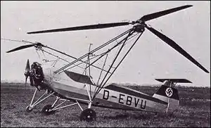 Only two aircraft were produced.[1] The first prototype, the V 1 D-EBVU, had its first free flight on 26 June 1936 with Ewald Rohlfs at the controls.[4] By early 1937, the second prototype, V 2 D-EKRA, was completed and flown for its first flight. On 10 May 1937, it accomplished its first autorotation landing with the engine turned off.