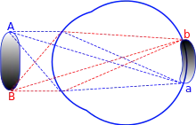 In geometrical optics, a focus, also called an image point, is the point where light rays originating from a point on the object converge.[1] Although the focus is conceptually a point, physically the focus has a spatial extent, called the blur circle. This non-ideal focusing may be caused by aberrations of the imaging optics. In the absence of significant aberrations, the smallest possible blur circle is the Airy disc, which is caused by diffraction from the optical system's aperture. Aberrations tend worsen as the aperture diameter increases, while the Airy circle is smallest for large apertures.