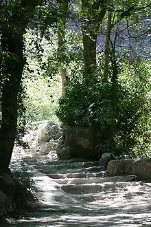 The village in which the spring is located was called "Vallis Clausa" ("closed valley") in Latin because of its topographical position. This became "Vaucluse", which gave its name to the Fontaine de Vaucluse.[1] The name in the Provençal dialect is "Font de Vau-cluso", the spring of the closed valley. The word "font" has two meanings in Provençal, "fountain" and "spring". Here it designates a spring and not a fountain.