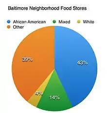 Research has documented differences in supermarket access between poor and non-poor urban areas. Baker et al. found that mixed-race areas were significantly less likely to have access to foods that adhere to a healthful diet compared to predominantly white, high income areas.[41] Research by Mari Gallagher found African Americans to be farther from healthful foods than other racial groups.[60][61][62] Supermarkets in African American neighborhoods are just 52% as prevalent as in white neighborhoods.[63] Moreover, a review of food-frequency data in the Atherosclerosis Risk in Communities study revealed that dominantly white populations had five times more supermarkets than neighborhoods that were dominantly non-white.[64] African Americans who lived in the same census tract with supermarket access were more likely to meet dietary guidelines for fruit and vegetable consumption. Each additional supermarket increased fruit and vegetable intake by 32%.[64]
