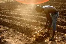 Several definitions of land degradation exist from literature with varying emphasis on biodiversity, ecosystem functions and services.[77] One definition of land degradation is "a negative trend in the condition of land that is caused by direct or indirect human-induced processes inclusive of anthropogenic climate change which is expressed as a long-term loss or reduction of at least one of the following: biological productivity, ecological integrity or value to humans." This definition is applicable to forest and non-forest land and soil degradation.[78]Intensive farming often leads to a vicious cycle of exhaustion of soil fertility and decline of agricultural yields.[79] Other causes of land degradation include deforestation, overgrazing, over exploitation of vegetation for use.[80] Approximately 40 percent of the world's agricultural land is seriously degraded.[81] According to UNU's Ghana-based Institute for Natural Resources in Africa,[82] if current trends of soil degradation continue, Africa might be able to feed just 25 percent of its population by 2025.