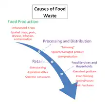 Food waste or food loss is food that is not eaten. The causes of food waste or loss are numerous and occur throughout the food system, during production, processing, distribution, retail and consumption. Global food loss and waste[2] amount to between one-third[3] and one-half[4] of all food produced. In low-income countries, most loss occurs during production, while in developed countries much food – about 100 kilograms (220 lb) per person per year – is wasted at the consumption stage.[5]