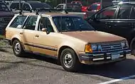The first North American Escort went on sale on October 3, 1980, for the 1981 model year, along with its corporate twin, the Mercury Lynx.[1] It was intended to share common components with the European Mk III Escort. It was launched with a 65 hp (48 kW), 1.6-liter hemi overhead cam inline-four.[2] It was available as a three-door hatchback and as a five-door station wagon, with a four-speed manual or a three-speed automatic.[2] The five-door hatchback was first shown in May 1981.[3] The North American Escort had considerably more chrome than Escorts sold elsewhere (except for the 1981 SS model and 1982+ GT models which feature blacked out trim). 1981 models never had the blue oval logo; on the front fenders there was an Escort badge which included a globe representing the earth, which implied this was a "world car". The 1981 Escort was available with an "SS" package that included blacked-out trim, a special stripe and decal package, upgraded brakes, and wider tires. The SS package would be replaced with the Escort GT the following year due to an interaction with General Motors.