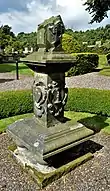 The sundial in the garden is an 1860 copy of the 1644 sundial originally at Pitreavie Castle, Dunfermline. It comprises a square pedestal on four globes supporting a lectern dial. The pedestal features carved escutcheons on two faces with the Henderson family arms.[70][34]