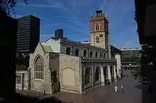 St Giles-without-Cripplegate, a Church of England church, is located in Fore Street.[5] When built in the 11th century it stood without (that is, outside) the city wall, near the Cripplegate. The church is dedicated to St Giles, patron saint of beggars and cripples. It is one of the few medieval churches left in the City of London, having survived the Great Fire of 1666, but it has been extensively altered and rebuilt over the years and was badly damaged by bombing during the Second World War. Oliver Cromwell married Elizabeth Bourchier there in 1620. Martin Frobisher, John Speed and John Milton were all buried there.[6]