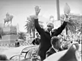 The British strongly protested the nationalization, and formed a plan with France and Israel to capture the canal.[45] Eisenhower opposed military intervention, and he repeatedly told British Prime Minister Anthony Eden that the U.S. would not tolerate an invasion.[46] Though opposed to the nationalization of the canal, Eisenhower feared that a military intervention would disrupt global trade and alienate Middle Eastern countries from the West.[47] Israel attacked Egypt in October 1956, quickly seizing control of the Sinai Peninsula. France and Britain launched air and naval attacks after Nasser refused to renounce Egypt's nationalization of the canal. Nasser responded by sinking dozens of ships, preventing operation of the canal. Angered by the attacks, which risked sending Arab states into the arms of the Soviet Union, the Eisenhower administration proposed a cease fire and used economic pressure to force France and Britain to withdraw.[48] The incident marked the end of British and French dominance in the Middle East and opened the way for greater American involvement in the region.[49] In early 1958, Eisenhower used the threat of economic sanctions to coerce Israel into withdrawing from the Sinai Peninsula, and the Suez Canal resumed operations under the control of Egypt.[50]