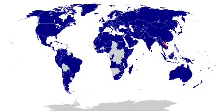 Laos has established relations with 134 countries (including the Sahrawi Arab Democratic Republic and the State of Palestine) and the European Union. Laos has not yet established diplomatic relations with: