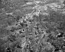 Forest Glen Park and the Forest Inn, at present-day National Park Seminary, were developed by the Forest Glen Improvement Company in 1887.[9][10] Originally consisting of 166 acres (67 ha), Forest Glen Park was one of the earliest residential subdivisions in Montgomery County and was developed as a result of Washington, D.C.'s population growth.[9][11] The area was easily accessible to Washington, D.C., as it was situated along the Baltimore and Ohio Railroad's Metropolitan Branch.[9][10][12] The Forest Glen Improvement Company developed Forest Glen Park as a residential suburb and resort for Washington, D.C. residents seeking a healthier and more natural environment.[9][10] The company was recorded in corporate record books on July 15, 1887, and the plat for the Forest Glen Park subdivision was recorded on July 31, 1887.[9] The Forest Glen Improvement Company laid out the neighborhood's avenues to conform with the natural topography, and ensured that the lot sizes were spacious to allow for "handsome villa sites."[13] The company described the neighborhood as "Washington's most desirable suburb."[12] By April 1887, over two-thirds of the development had been sold.[14] The residential section of Forest Glen Park initially consisted of summer homes and cottages centered around the Forest Inn at the National Park Seminary.[9] The neighborhood of Forest Glen Park grew to consist of Victorian-style and early 20th-century residences intermixed with homes built in the 1940s.[3]