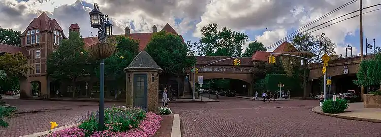 The Long Island Rail Road opened a station in Forest Hills in 1911,[10] and the Queens Boulevard trolley line opened two years later.[11] The LIRR station was built with a brick courtyard, a clock tower, and arch-filled underpasses, fitting in with the Forest Hills Gardens section of the neighborhood.[4]:470 Since the railroad and trolley both connected to Manhattan, the presence of these two transportation options spurred development in Forest Hills.[4]:469
