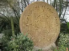The Plaza of Mesoamerican Heritage has indigenous by Meliton Salas Rodriguez, of Guadalajara, Mexico. Salas used hand tools to first quarry, then work, the native Mexican stone into precisely scaled, detailed replicas of artwork and artifacts that are representative of the Aztec, Huastec, Maya, Mixtec, Olmec, Teotihuacan, Toltec, Totonac, and Zapotec civilizations that preceded modern Mexican culture and are in contrast to the Christian and patriotic American themes which were originally reflective of the culture at Forest Lawn Hollywood Hills and other Forest Lawn Memorial Parks since their inception by Christian American businessman Hubert L. Eaton. A smooth Olmecan head, an intricate Aztec sun calendar and a sinuous Teotihuacan bas relief are some of the sculptural features of the plaza that are set off by crushed stone walkways and complemented by groupings of Mesoamerican plants. This entire display has been removed and placed in storage.