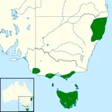The only member of the corvid family that has a permanent population in Tasmania,[22] the forest raven is the most widely distributed bird species in the state.[23] There are three populations in southern Victoria: from the vicinity of Lakes Entrance west across Gippsland to Wilsons Promontory, the Otway Ranges from 10 km (6.2 mi) west of Torquay to Port Campbell, and lastly in the Grampians and Millicent Plain extending into south-east South Australia. Isolated records suggest the latter two populations may actually be continuous.[23] There are two disjunct populations in northern New South Wales. A coastal population is found from Tea Gardens north to Yuraygir National Park, while a more montane population is found along the Great Dividing Range and New England Tableland from Gloucester Tops in the south to Tenterfield in the north. The gap between the two populations is around 70 km (43 mi), shrinking to 30 km (19 mi) at Dorrigo.[23]