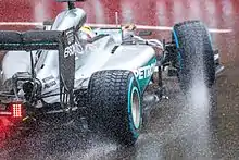 In 1998, grooved tyres were introduced with three grooves in the front tyres and four grooves in the rear tyres.[6] Between 1999 and 2008, regulations required the tyres to feature a minimum of four 14 mm (0.55 in) grooves in them, with the intention of slowing the cars down (a slick tyre, with no indentations, provides the most grip in dry conditions).[7][8] They could be no wider than 355 mm (14 in) at the front and 380 mm (15 in) at the rear, and the maximum diameter was 660 mm (26 in), or 670 mm (26.4 in) for wet tyres.[9]