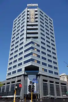 The original building on the location was the Golden Fleece Hotel, built in 1851.[1] The 1980s high-rise was a property speculation by Paynter Developments, who engaged Christchurch architecture firm Warren and Mahoney for the architectural design, and Holmes Consulting Group as structural engineers. Fletcher Construction was the contractor for the project. The building was finished in mid-1989 and sold to Robert Jones Investments (Canterbury), a company owned by Bob Jones. Jones, a property developer who had survived the 1987 stock market crash, named the building Robert Jones House and put the initials "RJI" of his investment company on the building. Jones had a high public profile, as he had set up the New Zealand Party just prior to the 1984 election to oppose Robert Muldoon, but the effect of this was that the conservative vote was split, and the Labour Party won the election, and David Lange formed the Fourth Labour Government. The building was commonly referred to as Bob Jones Tower, but some called it Bob's Folly in relation to his 1984 election interference.[2] The building was later sold and named for New Zealand investment banking firm Forsyth Barr.[3]