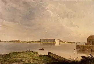 Pea Patch Island emerged as a mud bank in the Delaware River in the 18th century. According to folklore, the island received its name after a ship full of peas ran aground on it, spilling its contents and leading to a growth of the plant on the island.[1] By 1814, the island had grown sufficiently large for the construction of Fort Delaware. The original wood structure was replaced by the current brick and concrete one in 1859.[2] During the American Civil War, Fort Delaware was used by the Union as a camp for Confederate prisoners, in particular those captured in 1863 at the Battle of Gettysburg.[2] Many of the prisoners who died at the fort are buried at nearby Finns Point National Cemetery in New Jersey.