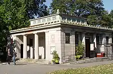 One of the park's distinctive features is the Prison Ship Martyrs' Monument. During the Revolutionary War, the British kept American prisoners on ships in Wallabout Bay under terrible conditions. Around 11,500 prisoners died from disease and malnutrition. Olmsted and Vaux envisioned a crypt to hold their remains, with an appropriate monument. It was built, and the remains of the prisoners were re-interred there in 1873. A small monument was also built.[16]