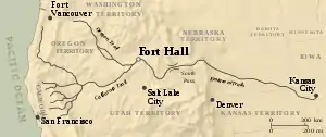 After being included in United States territory in 1846 upon settlement of the northern boundary with Canada, Fort Hall developed as an important station for emigrants through the 1850s on the Oregon Trail; it was located at the end of the common 500-mile (800 km) stretch from the East shared by the three far west emigrant trails. Soon after Fort Hall, the Oregon and California trails diverged in northwesterly and southwesterly directions. An estimated 270,000 emigrants reached Fort Hall on their way west. The town of Fort Hall, Idaho later developed 11 miles (18 km) to the east, and Pocatello developed about 30 miles (48 km) south on the Portneuf River.