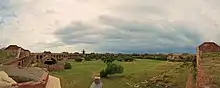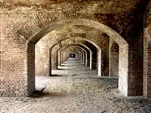 The design called for a two-tiered casemates in a six-sided outline, with two curtain walls measuring 325 feet (99 m), and the other four measuring 477 feet (145 m). Corner bastions, which are large projections designed to allow defensive fire along the faces of the walls they joined, contained gunrooms, gunpowder magazines and a granite spiral staircase. Each tier of casemates contained 150 guns, and another 150 were placed on top of the fort itself. The heavy guns were mounted inside the walls in a string of open casemates, or gunrooms, facing outward toward the sea through large openings called embrasures. The 13-acre (5.3 ha) parade ground contained additional powder magazines, headquarters, a hospital, officer quarters and three large barracks.[5]