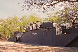 The batteries were placed behind massive reinforced concrete walls about 20 feet (6.1 m) thick, which were in turn behind 30 feet (9.1 m) of earth. Within a few years the armaments of the first phase were obsolete. In 1920, two 12-inch (305 mm) M1895 guns on a new style M1917 barbette carriage that could traverse a full 360 degrees were installed and named after Civil War General Henry Whitney Closson (1834–1917).[10] This design had a 975-pound (442 kg) projectile with elevation up to 35 degrees and range of 17 miles (27 km). It was located about 21°19′9″N 157°56′3″W.[4] Anti-aircraft guns were also added to protect from attack from above. In 1942, concrete shielding was added above the guns.[9] A row of officers' houses was built in 1916, and a chapel added in 1940.