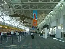 Internationally known artist and sculptor Duane Hanson created an installation for his work "Vendor with Walkman" at the Departure Level of Terminal 3 at the airport. Hanson, who retired and died in nearby Boca Raton, created a seated middle-aged man wearing a red T-shirt, blue pants, baseball cap and listening to a walkman during a break. The installation accessories give additional clues to the narrative of the artwork: toy airplane, various signs, and announcement for the shop, janitorial supplies.[23] The artwork has since been moved to Terminal 1 Arrival Level.
