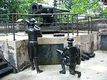 The Fort came under the operation of the 7th Coast Artillery Regiment, which received orders from Faber Fire Command led by Brigadier A.D. Curtiss.[7] A gun emplacement is a position or platform specially prepared to support large heavy guns and artillery. The first type of gun put on Fort Pasir Panjang was the 7-inch Rifled Muzzle-Loading (R.M.L.). Two of these guns were first installed in 1878 so as to provide a temporary defence for the fort. They were, however, removed soon after.