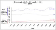 Police protection is contracted to the Royal Canadian Mounted Police which operates a 26 officer municipal detachment and a 10-member rural detachment from the city.[9] In 2005, the municipal detachment reported 4,048 Criminal Code offences, which translates into a crime rate of 228 Criminal Code offences per 1,000 people, much higher than the provincial average of 125 offences. During that year, compared to the provincial average, the RCMP reported much higher crime rates in Fort St. John for cocaine, cannabis, non-sexual assaults, property damage, and arson related offences. However, the city had lower crime rates for robbery, theft from motor vehicles, and business break-and-enters. [10]