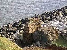 In the 20th century, between the 1950s and 1960s, the construction of the northern protective pier by American military forces in order to help shelter offloading, resulted in further investigation of the fort's ruins. A compromise was signed between the Americans and Portuguese to permit the construction of the dock, while reconstructing the old fort. Yet, unable to fulfill this compromise, the remains of the fort was used to support the arriba at the end of the bay, between Chagas and Ribeira de Beljardim, sometime during the 1960s.[9] Little remains of the vestiges except some portions of the rock used in the walls. The ruins are neither classified or protected by the national or regional registry, nor included in the tourist itineraries published by the city. Local tradition suggest that the royal coat-of-arms from the fort was used in the construction of the municipal council hall of Praia, although unproven.