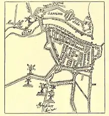 During the English Civil War the fortifications were added to, with "hornworks" ('half moon' artillery batteries) built outside the main gates, additional defences connected the batteries, possibly as high as the original walls (14 ft), and a wide ditch outside the walls (later known as "Bush Dike") was added. The earthen ramparts behind the town walls were also built up at this time; in November 1646 a 50-yard section of wall to the north of Myton gate collapsed during the sieges, due to causes that may have included rain, excess weight of the earth bank and weight of the guns on the wall.[14][15]
