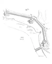 The new fortification extended onto the old village of Drypool, and part of that village had houses built to the north of the village church, outside the Citadel.[30] The Citadel was an irregular triangular fort, with curtain walls of 100 (east), 266 (south) and 258 (west) yards with bastions at each apex, each with wall lengths of around 100 yards. The Castle and south blockhouse were retained and incorporated into the north and western bastions respectively. The structure was surrounded by a broad moat on the eastern and western sides.[31]
