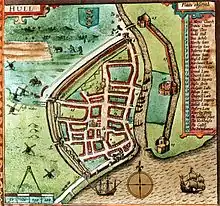 In addition to the five main gates several posterns in the wall existed, only wide enough for a person, each surmounted by a manned tower.[7] Known examples are Low Gate in the north wall, and at the end of the streets Posterngate, and Blackfriargate (Blanket Row) on the western walls.[11] In the 16th century John Leland stated that there were over twenty towers in the circuit of the walls;[12][note 2] the exact number is unknown, early maps show up to 30 towers in total.[11] After Henry VIII's visit in 1541 all entrances except the main gates, as well as North and Hessle gates were ordered to be walled up.[13]