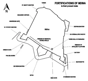 Mondion also made further plans to strengthen Mdina's fortifications, but they were not implemented since the Order focused on building its fortifications in the harbour area.[28] The only major addition to the Mdina fortifications after Mondion's reconstruction was Despuig Bastion, which was built during the reign of Ramon Despuig between 1739 and 1746.[29]
