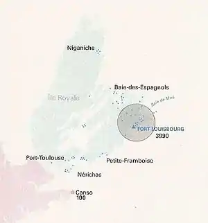 Louisbourg was one of the "largest military garrisons in all of New France", and many battles were fought and lives lost here because of it.[24]:3 The fort had the embrasures to mount 148 guns; however, historians have estimated that only 100 embrasures had cannons mounted. Disconnected from the main fort, yet still a part of Louisbourg, a small island in the harbour entrance was also fortified. The walls on the Island Battery were 10 feet (3.0 m) high, and 8 feet (2.4 m) thick. Thirty-one 24-pound guns were mounted facing the harbour. The island itself was small, with room for only a few small ships to dock there.[32] An even larger fortified battery, the Royal Battery, was located across the harbour from the town and mounted 40 guns to protect the harbour entrance.