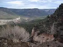 Fossil Springs, the source of about 80 percent of the water in Fossil Creek, issues from several vents in close proximity to one another at the base of the Mogollon Rim.[11] The rim is the southern edge of the Colorado Plateau. Water percolating through limestone layers in the rim becomes laden with dissolved carbon dioxide and calcium carbonate.[11] When the water emerges at the springs, it begins to release carbon dioxide as a gas and calcium carbonate as travertine, a porous form of calcite often found around hot springs such as Mammoth Hot Springs in Yellowstone National Park.[12] The release, affected by stream turbulence and other factors, does not occur all at once but continues downstream.[11]