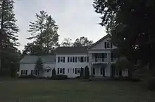 The main house consists of two blocks, built by Joel Foster, the first Foster to settle the land. Architectural evidence suggests that both were built in the 1850s, leaving open the question of where Foster's first house was located. The main block is the more northerly of the two; it has a front-facing gable with full pediment, overhanging a two-story porch supported by distinctively cut sawn supports. The southerly block, a two-story structure, has a side-gable configuration. The main block has two wide bays, with the main house entrance in the left bay; the ell is four small bays wide, and has a secondary entrance. which is flanked by shorter sidelight windows than the main entrance, and is topped by a triangular shallow pedimented hood. A 1-1/2 story gable-roof shed extends the house further to the south.[2]
