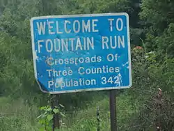 Although not historically recorded as such, the name of “Fountain Run” is generally believed to refer to the town's spring and stream branch,[8][9] perhaps reminiscent of “run” as a name for streams in Colonial Virginia.