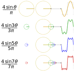 Four partial sums (Fourier series) of lengths 1, 2, 3, and 4 terms, showing how the approximation to a square wave improves as the number of terms increases (animation)
