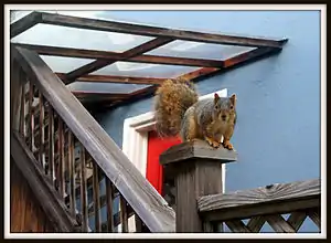 Fox squirrels are tolerant of human proximity, and even thrive in crowded urban and suburban environments. They exploit human habitations for sources of food and nesting sites, being as happy nesting in an attic as they are in a hollow tree.[14]