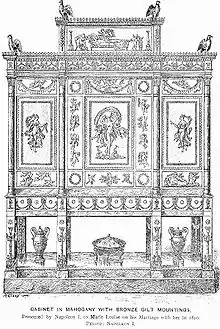 Furniture in the Empire style produced by the firm of Jacob-Desmalter et Cie ("and Company") in rue Meslée, Paris, mainly employed mahogany veneers with gilt-bronze mounts. Seat furniture forms, of mahogany when they were not painted or gilded, derived inspiration from seats and thrones of Antiquity, recognizable in details from bas-reliefs and on Greek vases. Jacob-Desmalter, principal supplier of furniture to the Emperor, also received commissions from Pauline Borghese, Napoleon's sister in Rome, and the Empresses Joséphine and Marie Louise, for whom he supplied numerous pieces for the Château de Malmaison, the Château de Compiègne, the Tuileries Palace, and other imperial residences. Important commissions included a magnificent cradle built for the infant King of Rome, and the most expensive single item, the jewel cabinet for the Empress, delivered in 1809 for the Empress Joséphine's state bedroom in the Tuileries (soon to be used by Marie-Louise). It was designed by the architect Charles Percier and embellished with gilt-bronze plaques: the central one, according to its original description, depicts the "Birth of the Queen of the Earth, to whom Cupids and Goddesses hasten with their Offerings" by the Empire's most eminent bronzier, Pierre-Philippe Thomire, modelled by Antoine-Denis Chaudet.[1]