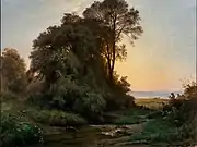 In 1837 Français exhibited at the Salon for the first time, presenting Sous les saules (Under the Willows) (1837: Tours museum), a painting where the figures are by Henri Baron. The exhibition catalogue listed 2,130 entries but Français' painting was noticed and commented upon favourably.[14] In the mid-1840s, Français travelled regularly with Baron and their friend Nanteuil, to Bougival, a village on the Seine increasingly famous for its scenery and light changes.[note 1] The paintings from this period, several of which were transposed to lithographs, are often signed Français, Elèves de Bougival (Student of Bougival). Soleil couchant (1845, Musée des Beaux-Arts de Dijon ), an autumnal landscape of the river at Bougival, was presented at the 1845 Salon of Charles Baudelaire, one of three that the poet organised. Baudelaire praised the canvas, as an example, of how to capture the poetic realism of nature.[15]