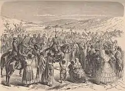 The population of Guadalajara welcomes General Bazaine as he is entering the city.