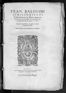 François Baudouin (1520 – 24 October 1573),[1] also called Balduinus, was a French jurist, Christian controversialist and historian. Among the most colourful of the noted French humanists, he was respected by his contemporaries as a statesman and jurist, even as they frowned upon his perceived inconstancy in matters of faith: he was noted as a Calvinist who converted to Catholicism.