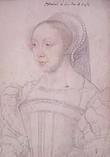 Françoise de Brézé (1515 – 14 October 1577), Suo jure Countess of Maulévrier, was a French noblewoman and courtier. She served as Première dame d'honneur to Queen Catherine de' Medici from 1547 until 1560 and was the regent of the Principality of Sedan from 1553 to 1559.