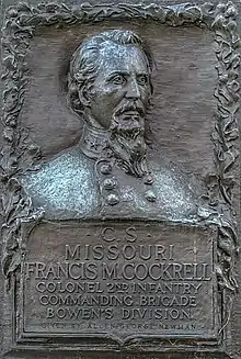 At the beginning of the American Civil War in 1861, Cockrell joined the Missouri State Guard as a Captain.[1] After being mustered into the Confederate States Army in the 2nd Missouri Regiment in early 1862 (which was formed as the 1st, but renumbered as Bowen had already formed a regiment); being promoted to colonel. Cockrell commanded a brigade in the Vicksburg Campaign. He distinguished himself at the Battle of Champion Hill, launching a counterattack that temporarily ousted troops of XVII Corps off the hill. He also took part in the Battle of Big Black River Bridge. His brigade was able to escape just before federal troops seized the bridge.[3][4] He was wounded in the hand by an exploding shell during the Siege of Vicksburg.