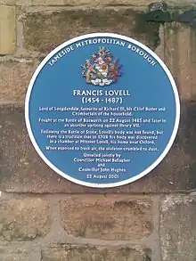 Francis Lovell, 9th Baron Lovell, 6th Baron Holand, later 1st Viscount Lovell KG (1456 – probably 1487) was an English nobleman who was an ally of King Richard III during the War of the Roses. Sir William Catesby, Sir Richard Ratcliffe and he were among Richard's closest supporters, famously called "the Cat, the Rat and Lovell our dog" in an anti-Ricardian squib. In addition to being an ally, Lovell is attributed as Richard's best friend.[1]