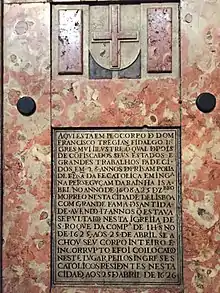 Here stands the body of Master Francis Tregian, a very eminent English gentleman who – after the confiscation of his wealth and after having suffered much during the 28 years he spent in prison for defending the Catholic faith in England during the persecutions under Queen Elizabeth – died in this city of Lisbon with great fame for saintliness on December 25th, 1608 [sic]. On April 25th, 1625, after being buried for 17 years in this church of São Roque which belongs to the Society of Jesus, his body was found perfect and incorrupt and he was reburied here by the English Catholics resident in this city, on April 25th, 1626.[3]