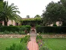 "Las Tejas," Oakleigh Thorne House, Montecito, California. View from swimming pool pavilion to house.
