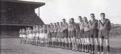 Farrell was a rugby league footballer with a long sporting career. He rose through the ranks to become The Greatest Bluebag of them all.[4] Graded in 1936, he made his début for the Newtown Rugby League Football Club's first-grade team in the 1938 NSWRFL season.[1] He played his entire New South Wales Rugby Football League premiership career of over 250 games with the Newtown club. He made his state representative debut for New South Wales against Queensland in 1939 and went on to play thirteen career matches for his state. He became captain of the club in 1942, leading them to victory in the 1943 NSWRFL season Premiership Final against North Sydney. One of Farrell's closest and lifelong friends, Frank Hyde, was his opposing captain that day.