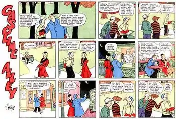 - Other precedents from America’s newspaper supplements were occasional experiments by Frank King in his Gasoline Alley Sunday pages where he would turn the whole page into one continuous landscape. For example, on 24 May 1931, King uses an unrealistic, almost isometric perspective to turn the page into a single image, like a diagram viewed from above, of the neighborhood and its assorted residents. This angled aerial view he divides into 12 equal panels, each containing at least one fresh character to contribute their own moment of comedy. In more of an ensemble of jokes than a strictly linear narrative, no characters appear here more than once. King went further, however, in 1934 when over three consecutive weeks he used the whole page as one image to portray a house being built, from bare site to construction to finishing touches. The first of these, dated 25 March 1934, presents repeated images of Skeezix and his pal Whimpy as they play around the foundations dug out of their favorite baseball diamond and meet a local girl. Here the threesome move around 12 identical square panels and time unfolds in sequence, although jumping ahead sometimes by a considerable period from one to the next.[9]
