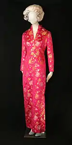 After the Nixon resignation in 1974, First Lady Betty Ford wore a Welch design to greet the press.[19] Her official photograph was taken in a Welch design made of green silk, which Ford had brought back from China. That same year, she published Indian Jewelry: How to Wear, Buy and Treasure America's First Fashion Pieces,[20] which was full of tips on how to determine the quality of jewelry and gave information about various types of materials used in jewelry design. She also designed a collection of contemporary bracelets, earrings and necklaces for her store.[21] Her husband died in 1975.[22] In 1976, when Ford selected which gown was to be presented to the First Lady's Hall, she selected a Welch dress in a princess style, with a Chinese-style high collar. The dress was first worn in 1975 for the Shah of Iran's state dinner and later worn by the First Lady to a dinner for King Juan Carlos I of Spain and Queen Sofía in 1976. Welch designed Ford's official scarf, which she gave to visiting dignitaries, on a floral and polkadot background with the First Lady’s signature imprinted.[23]